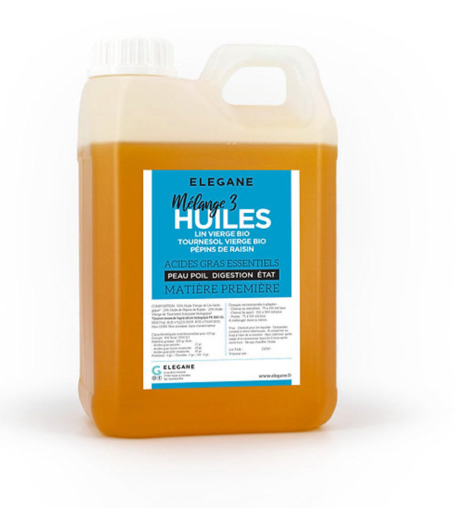 Ce mélange unique d'huiles végétales offre une solution naturelle et efficace pour le bien-être global de votre cheval, quel que soit son âge. Combinant les bienfaits de l'huile de lin bio, de l'huile de tournesol bio et de l'huile de pépins de raisin, ce mélange est riche en acides gras essentielspour optimiser la santé et l'état général de votre animal.