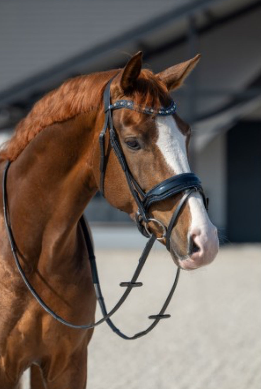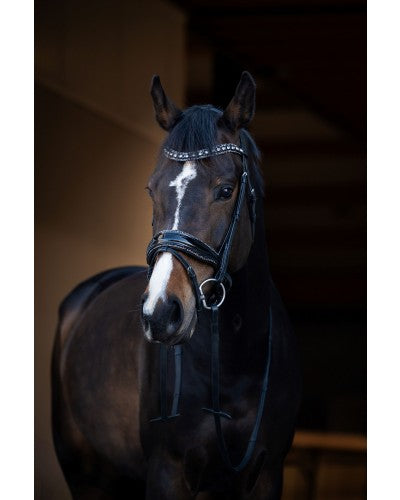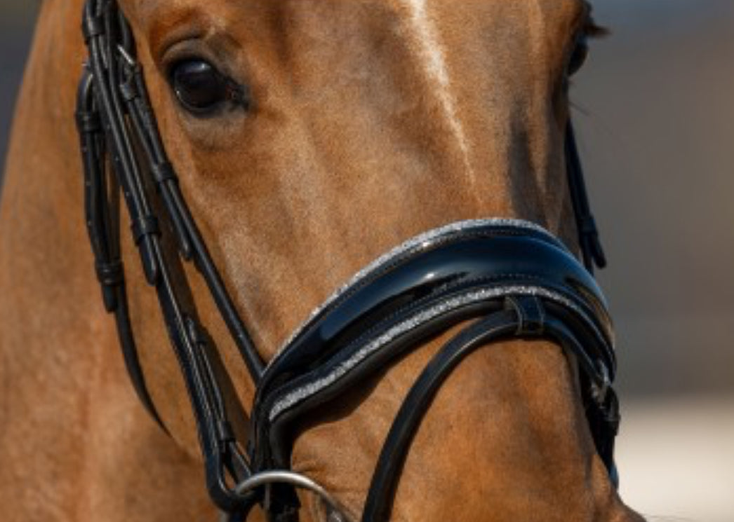 Ce bridon a été spécialement conçu avec une têtière anatomique, douce et découpée en retrait. Cette têtière est façonnée de manière à réduire la pression derrière les oreilles et sur la tête.