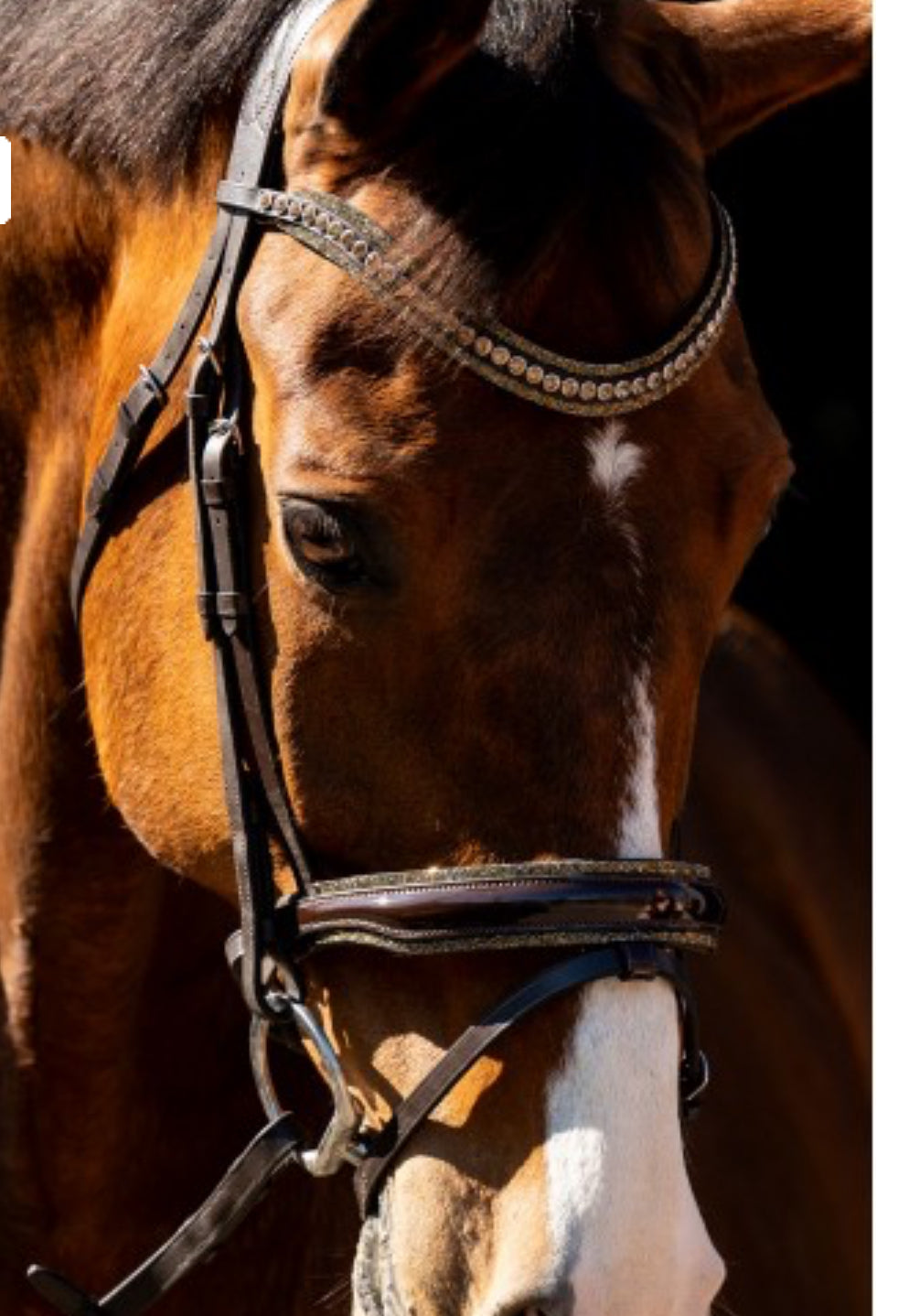 Ce bridon a été spécialement conçu avec une têtière anatomique, douce et découpée en retrait. Cette têtière est façonnée de manière à réduire la pression derrière les oreilles et sur la tête. La muserolle est également de forme anatomique, ce qui offre un ajustement encore meilleur. Elle est en plus décorée de larges paillettes rocky assorties au frontal.