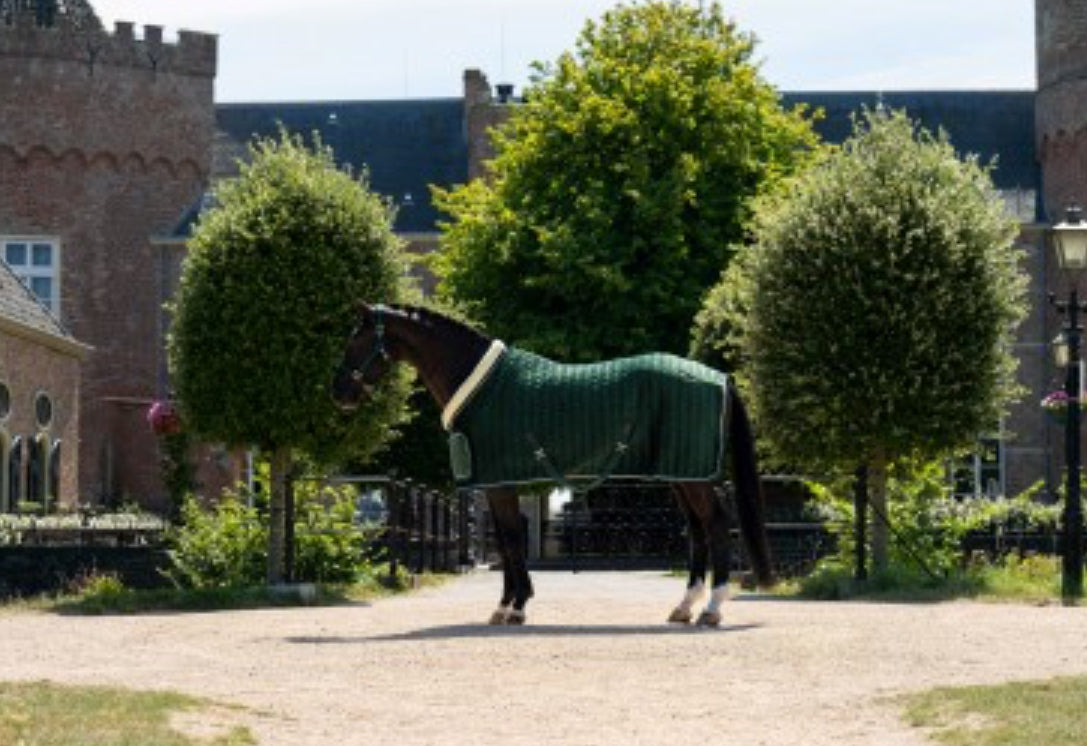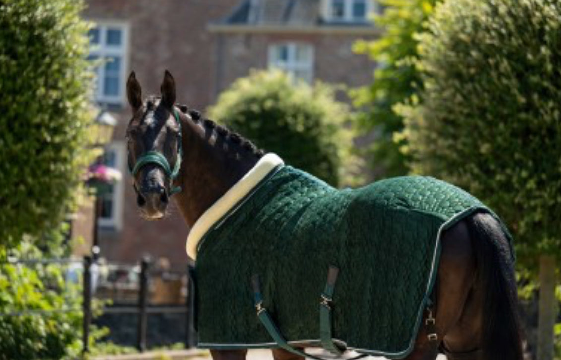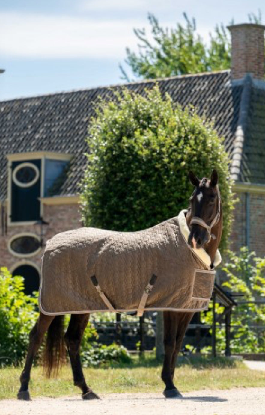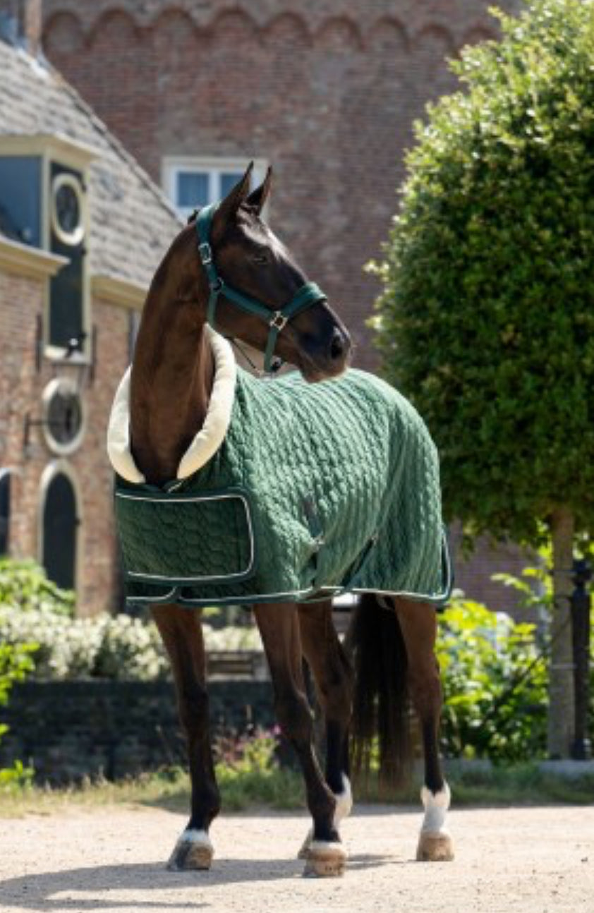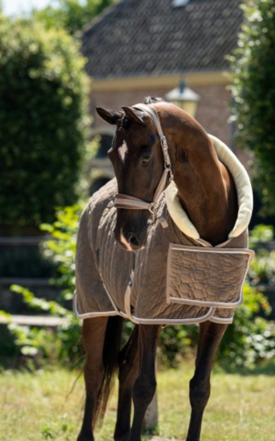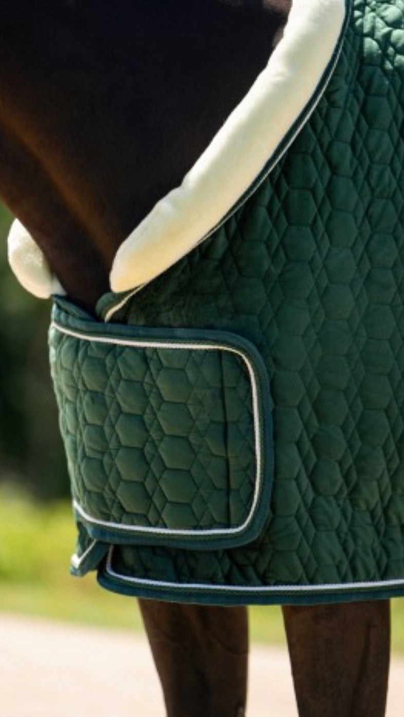 Couverture en velours luxueuse matelassée avec col en fausse fourrure teddy crème, sangles croisées et deux cordons décoratifs.