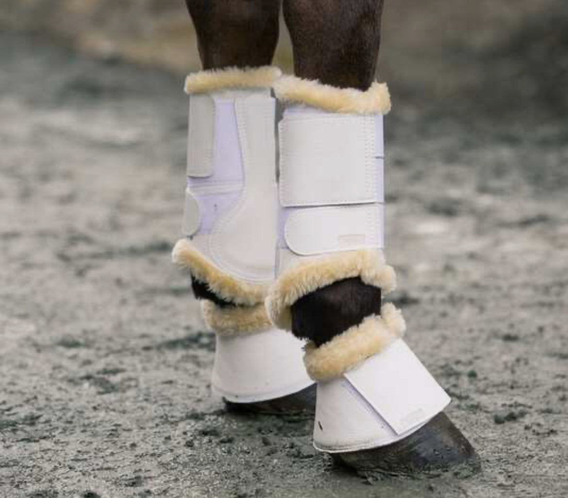 Cloches montantes bordées de fausse fourrure au niveau du bourrelet périoplique qui sont idéales pour protéger les talons et l'arrière du paturon, que ce soit pour sauter ou s'entraîner.