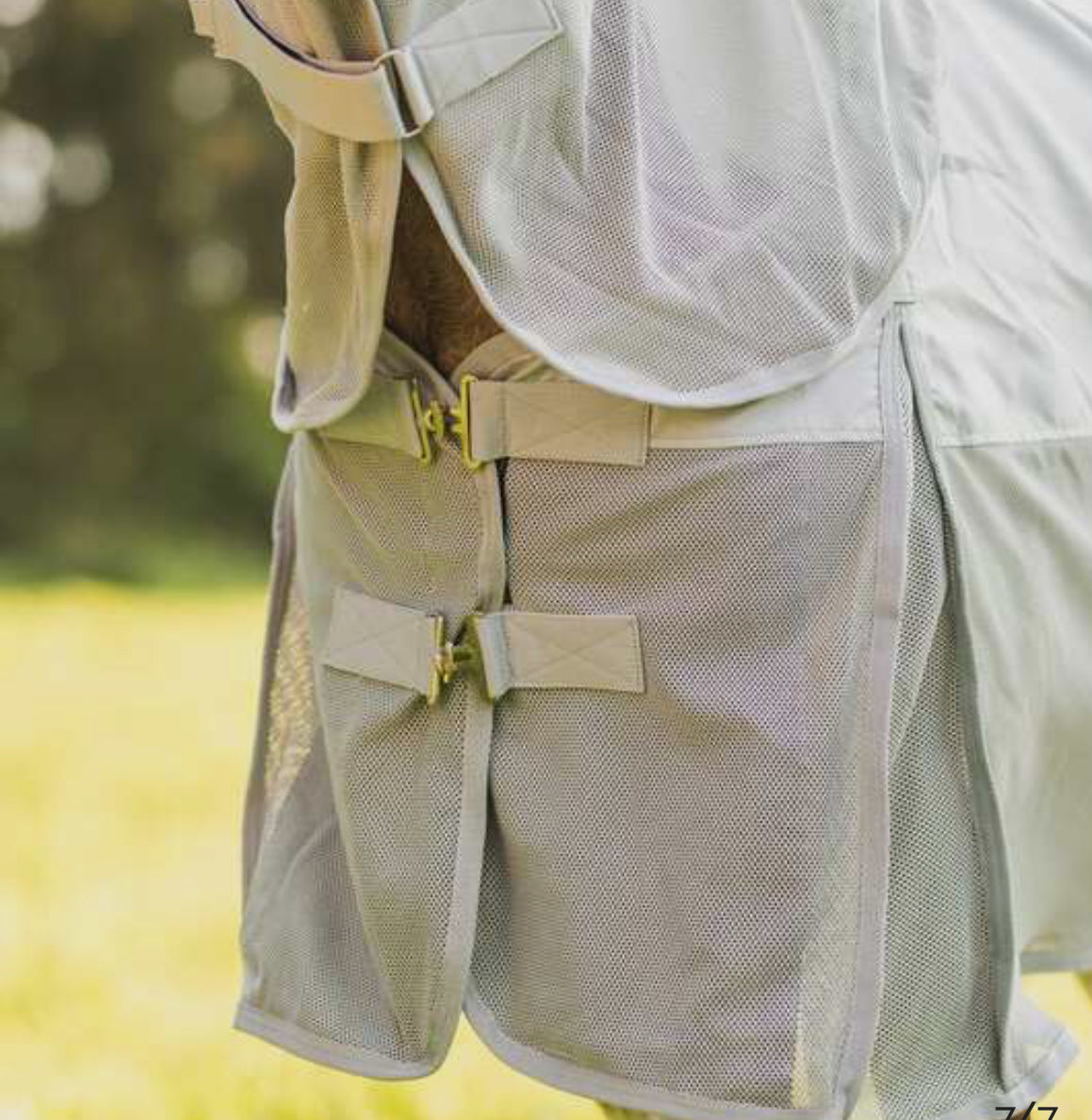 Lorsqu'une couverture légère est nécessaire pour protéger votre cheval contre les averses et les insectes, cette combinée est celle qui conviendra parfaitement à cet objectif. La partie supérieure et l'arrière sont en polyester imperméable tandis que les côtés sont en maille filet mesh respirant protégeant contre les insectes.