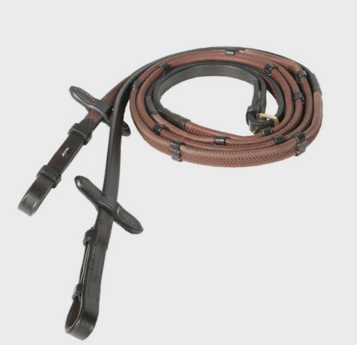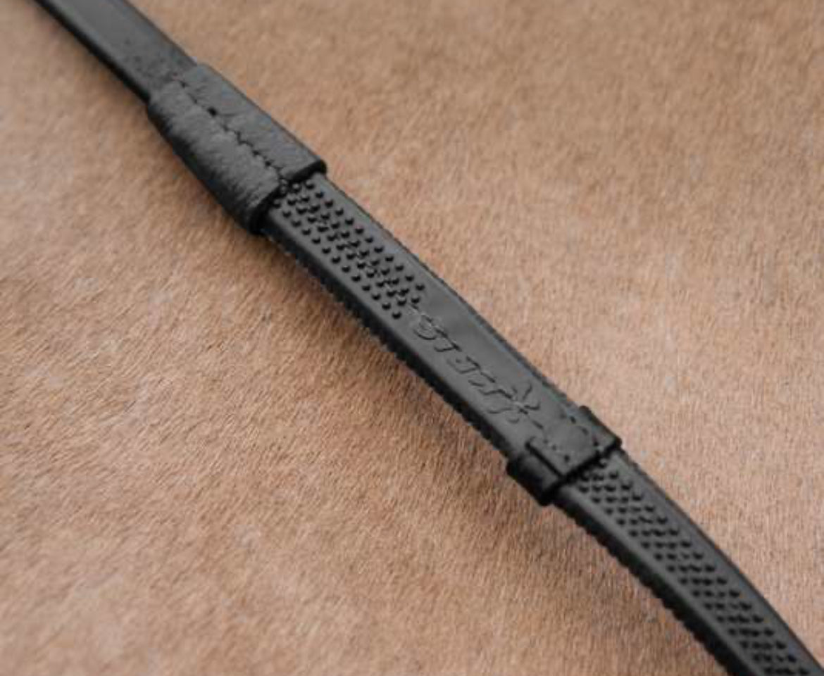 Les arrêtoirs cuir viennent en supplément pour assurer une prise encore meilleure sur ces rênes caoutchouc.