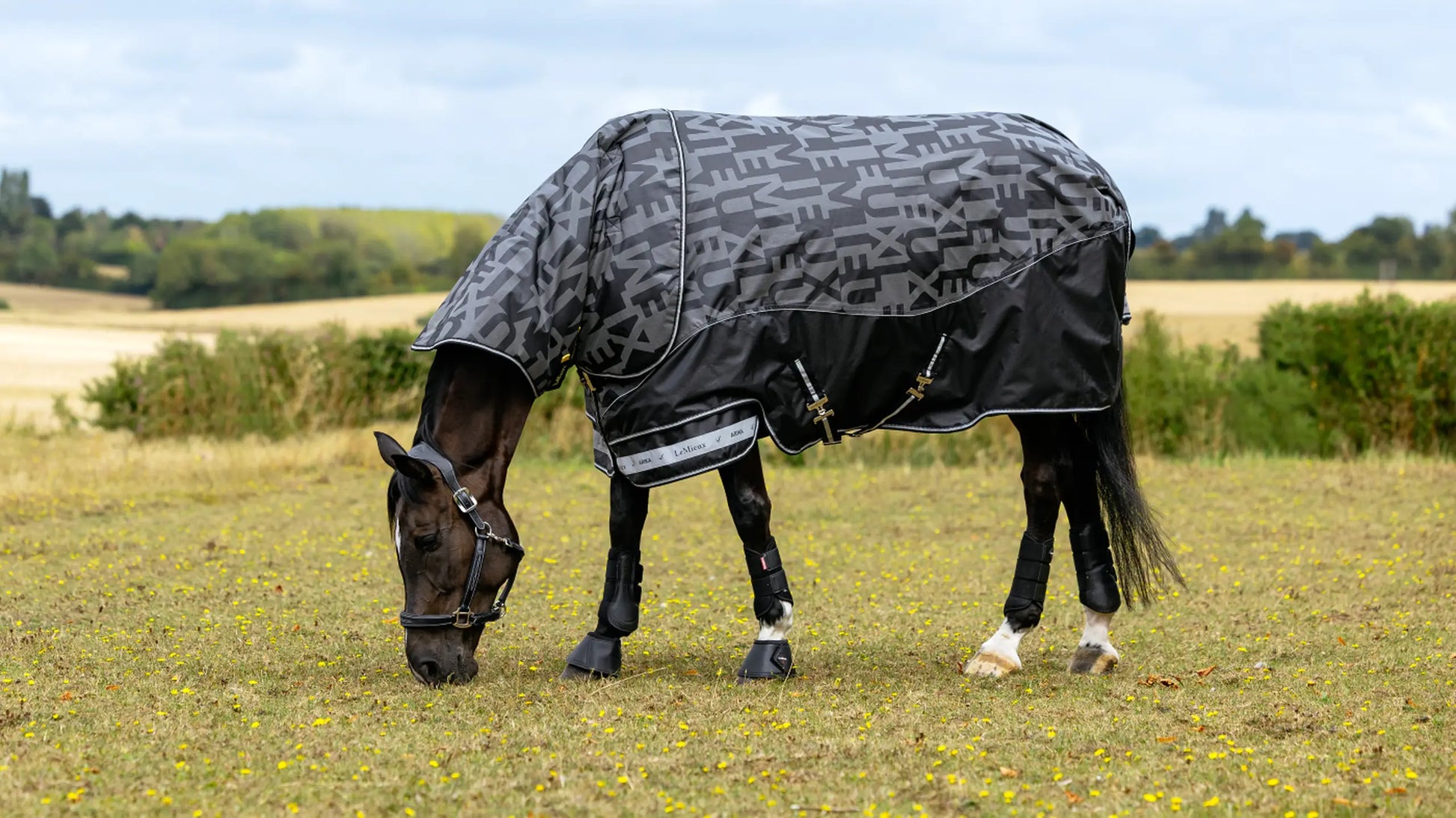 Une sangle en filet revêtue de PVC, des sursangles croisées et des sangles élastiques aux jambes empêchent la couverture de glisser. Un col amovible entièrement réfléchissant est inclus.