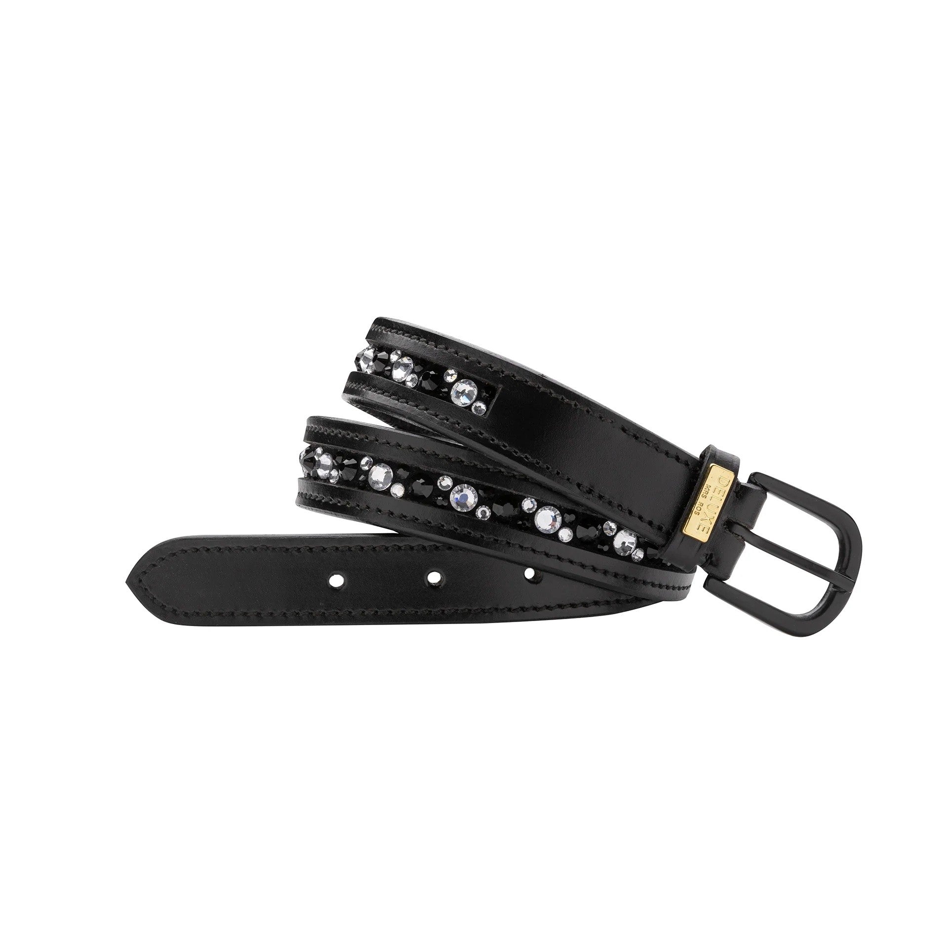 Élève ton style équestre avec cette ceinture chic en cuir véritable, conçue pour les jeunes cavaliers qui aiment une touche d’éclat. Habillée de pierres STELLUX™ noires et crystal, et décorée d’une plaque dorée gravée du logo Mini Ros, cette ceinture apporte juste ce qu’il faut de glamour à n’importe quelle tenue d’équitation.