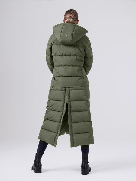 Manteau puffer 3-en-1 avec jupe et capuche amovibles, pour une utilisation polyvalente à cheval comme à pied. Peut se porter en manteau long, en veste courte, ou avec la jupe séparément. La jupe peut être retirée après l’échauffement du cheval ou fixée à l’aide de sangles élastiques afin de garder les jambes du cavalier au chaud lors des sorties en extérieur.