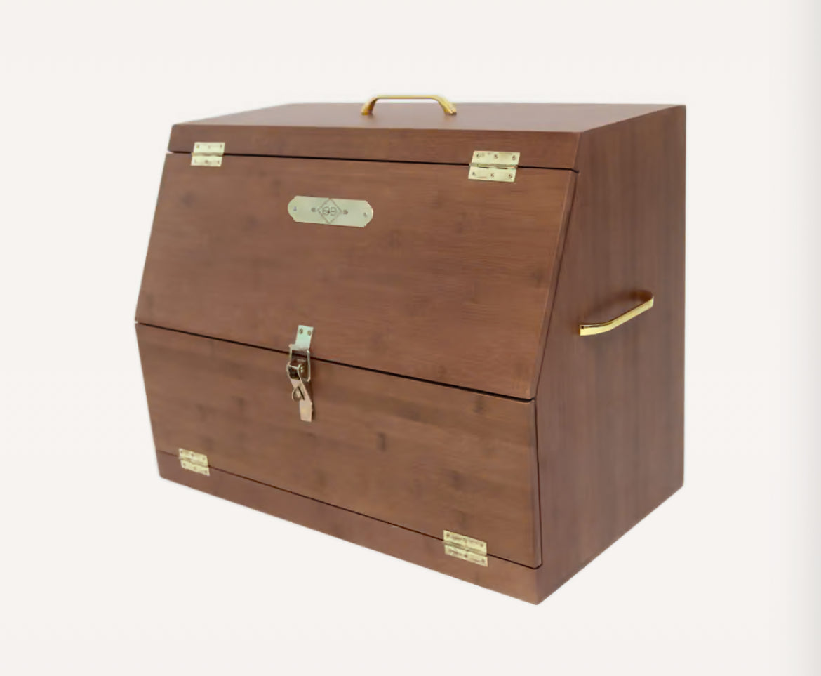 Cette boîte de pansage “Show” va rapidement devenir votre meilleure alliée pour stocker votre matériel de pansage en concours comme à la maison. Elle mesure 43,5cm de haut, 59,5cm de large et 32cm de profondeur. La boîte s’ouvre avec deux portes, maintenues ensemble par une fermeture à cliquet dorée sur laquelle vous pouvez ajouter un cadenas si vous le souhaitez. A l’intérieur, vous trouverez 2 petits tiroirs (9,5x27,5x20 cm), un plus grand tiroir (14x27,5x28,5 cm), un grand compartiment (28,5x28x29 cm) et un plus petit (8x28x28 cm). Tous les tiroirs et le bas du petit compartiment peuvent être retirés. Cela est très pratique si vous avez besoin de plus d’espace, si vous voulez accéder à vos produits ou si vous souhaitez nettoyer la boîte. Elle est faite de bambou, ce qui la rend extrêmement résistante et facile à nettoyer. Elle possède 3 poignées dorées pour la transporter plus facilement. Tous vos produits organisés avec style grâce à cette jolie boîte de pansage !